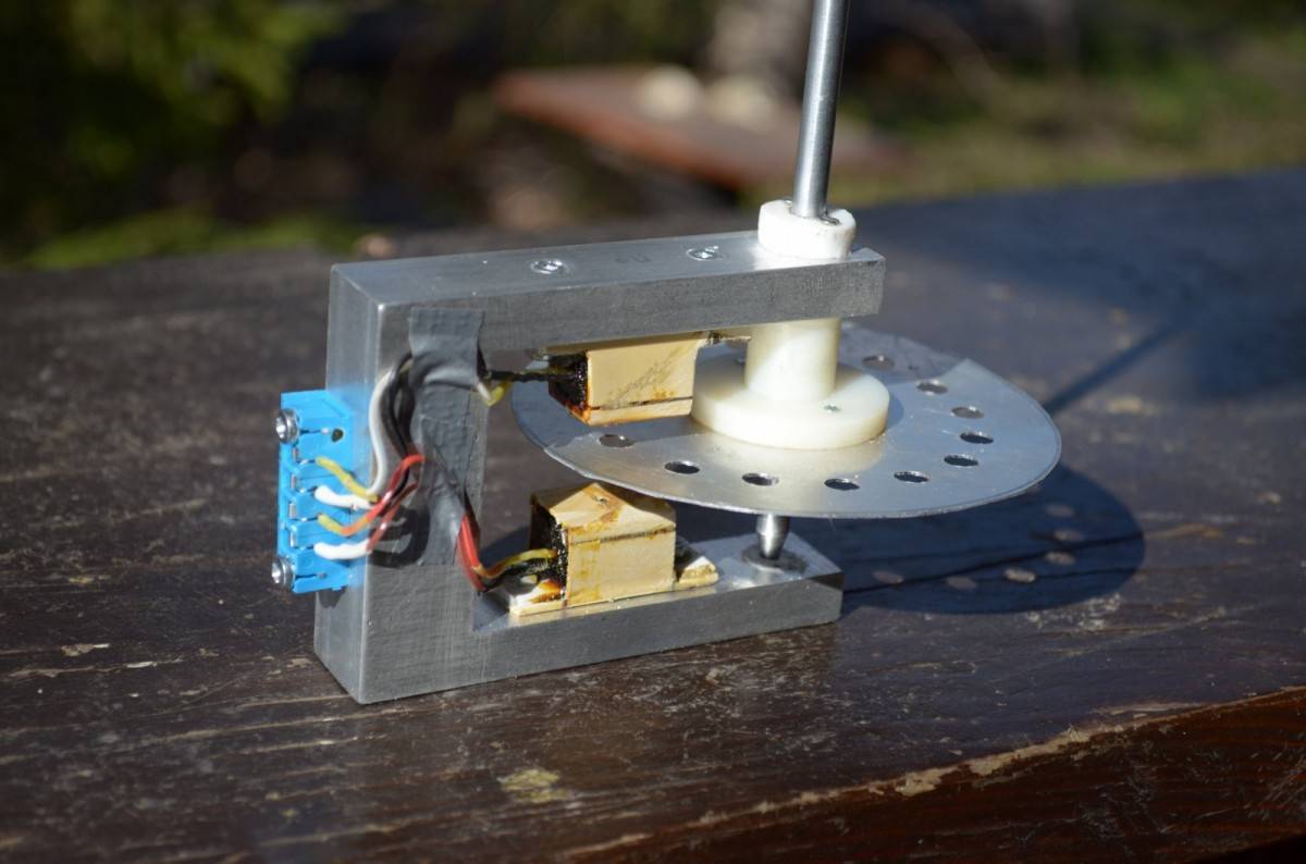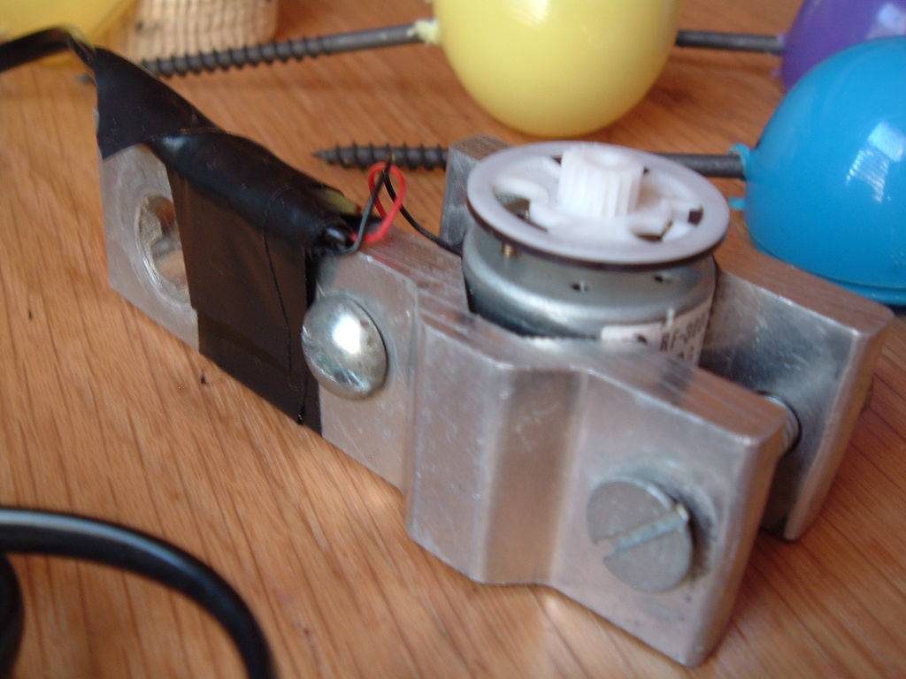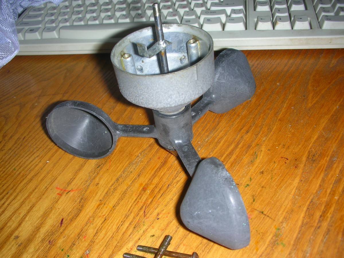 Приложив немного старания и желания, можно смастерить самодельный анемометр в домашних условиях. Для изготовления устройства понадобится старый видеомагнитофон, вернее, его часть называемая блоком вращения головок. Из него надо удалить все лишнее, оставив каркас из металла вращающейся головки с осью, часть с блоком подшипников и шайбу крепящую двигатель. Устройство будет измерять среднюю и сильную скорость ветра.