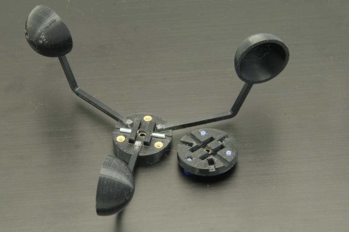 - Вставляем в дыры болты М4 размером 10 мм. Чтобы обеспечить хороший контакт с лопастями из подручного материала (камера велосипеда) вырезаем шайбы, чтобы чашки не вращались;Берем части видеоголовки, просверливаем в них отверстия и подготавливаем резиновые шайбы
