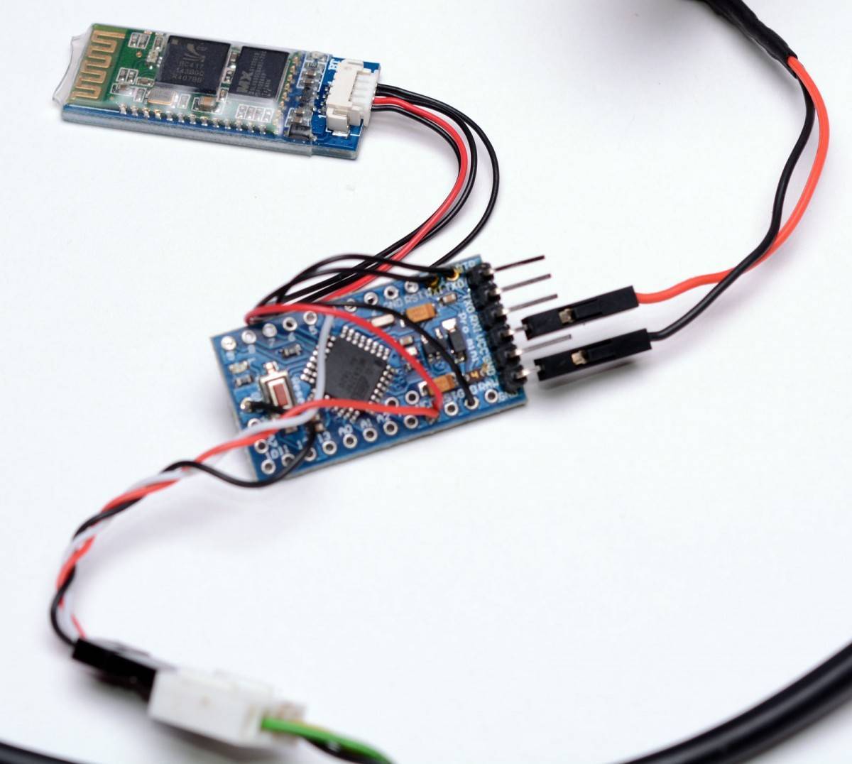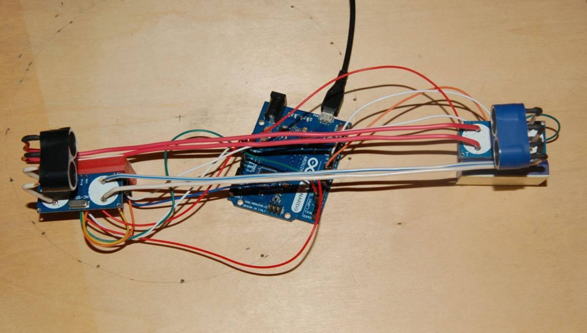 - Подключаем кабель. Удлиняем кабель датчика с помощью компьютерного кабеля. На снимке показан настольный вариант велокомпьютера, он медной проволокой прикручен к системе двигателя видеоголовки.Сверлим отверстия для уголка, дорабатываем его и крепим к конструкции