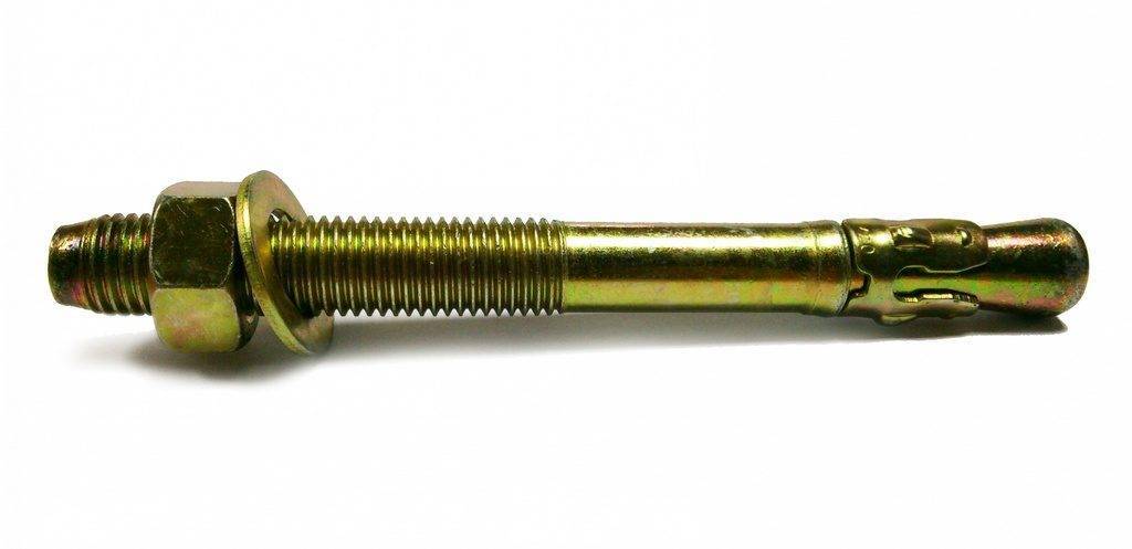 - клиновой анкер-болт. Он выполнен в виде металлической шпильки с цанговой втулкой, которая при вкручивании стержня увеличивается в диаметре и расклинивается в полости. Это обеспечивается за счет перемещения конусообразной части стержня внутри распорной втулки. На резьбовой части такого анкера навинчена гайка, под которой находится шайба. Монтаж клинового фиксатора производится в предварительно выполненное отверстие с последующей затяжкой гайки рожковым ключом. При перемещении шпильки в процессе завинчивания, конусная втулка контактирует с цанговым зажимом, который разжимается и расклинивается. Такой крепежный элемент способен воспринимать повышенные нагрузки. Однако он создает в материале повышенное напряжение по площади контакта, что не позволяет использовать его в ячеистых бетонах;