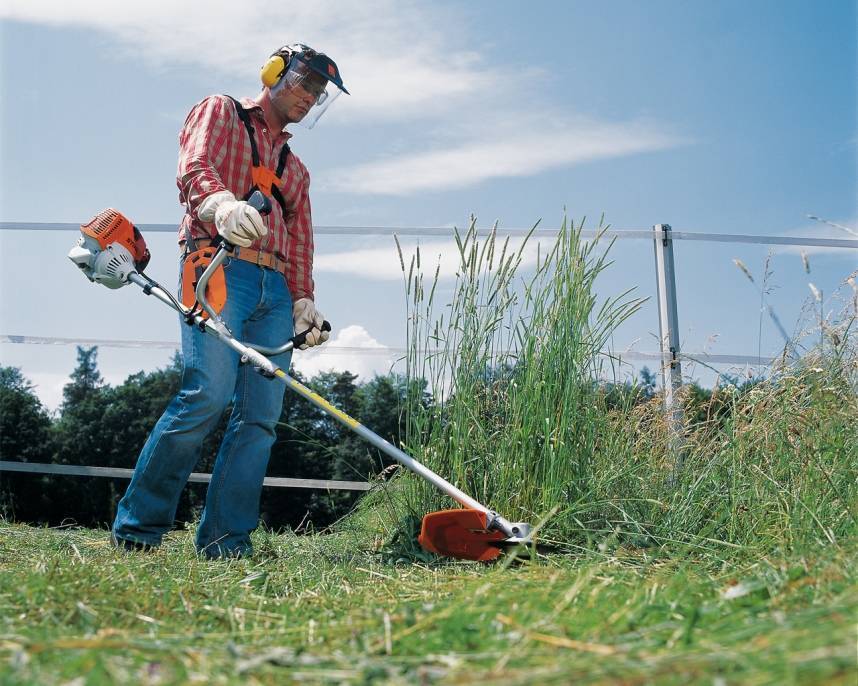 перед покосом одеваться в плотную одежду, чтобы не травмировать кожу кусочками травы стеблей, отлетающих от диска или лески с большой скоростью;