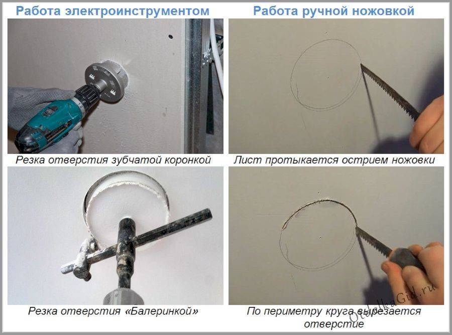 Для начала необходимо убедиться в надёжности крепления гипсокартона, после чего нужные нам мелкие отверстия аккуратно вырезаются лобзиком, дрелью с насадкой или же электродрелью. Крупные отверстия рекомендуется вырезать ножом по нанесённой разметки. При получении неровных краёв, их можно удалить наждачкой или же ножовкой.