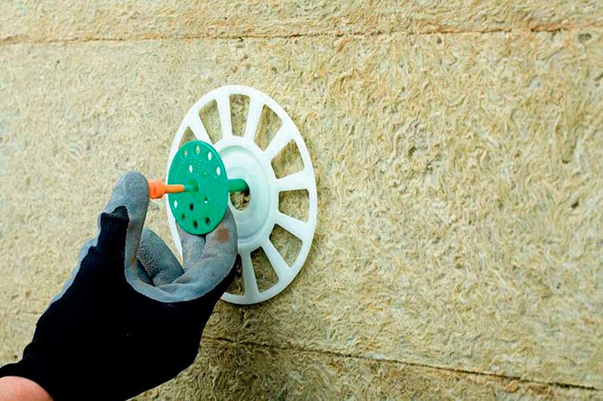 - крепление утеплителя осуществляется посредством клея и специальных дюбелей, если стена каменная, либо посредством гвоздей (саморезов) с большими шайбами, если поверхность деревянная. На 1 кв. м необходимо 5-6 штук;