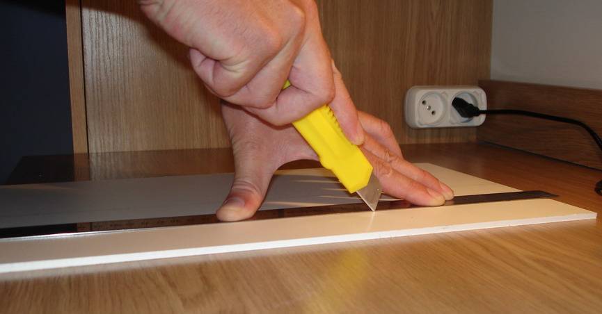 Самым простым способом избежать повреждений на панели, является ее резка острым ножом. Лучше всего пользоваться большим канцелярским инструментом со сменным лезвием. Если его кончик затупился, негодную секцию просто отламывают и продолжают работу. Панель фиксируют струбцинами на ровной поверхности и, используя металлическую линейку в качестве направляющей, производят разрез в несколько движений.