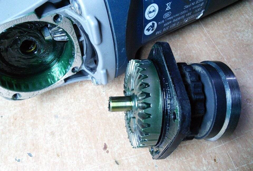 Чтобы убедиться в необходимости внесения нового объема смазки, редуктор требуется разобрать, выкрутив на его крышке винты. Внутри находится пара косозубых шестеренок. Малая размещена на якоре и применяется для приведения в действие большой, расположенной на вторичном валу. К этому валу прикрепляется шлифовальный либо отрезной диск.