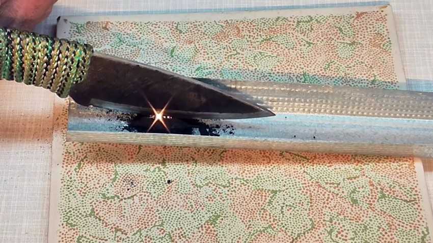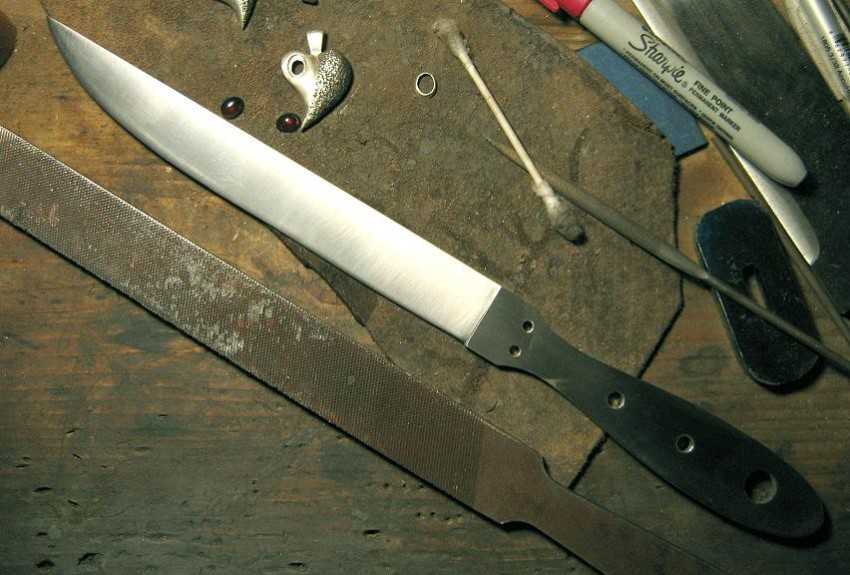 Берем нож.Проходимся по кромке надфилем, при этом обращаем внимание на глуховатый звук и легкое стачивание металла. Все свидетельствует о том, что нож сделан из обычной стали и не закален ранее.Для закалки понадобиться графит