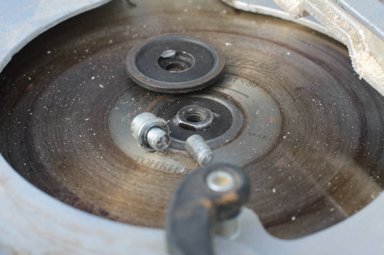 - Снять фиксирующую и центровочную гайку. После этого, приподняв пильный диск вверх, отвести в сторону, тем самым демонтировав его.