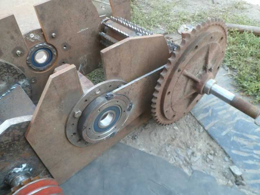Мотор установить на краю станины, а барабан с ножами — примерно посередине. Двигатель закрепить жёстко, на гайки и болты. Барабан следует монтировать на раму посредством подшипников, через втулки. Саму раму с валом установить на станину так, чтобы имелась возможность небольшого продольного перемещения барабана, для регулировки натяжения ремня.