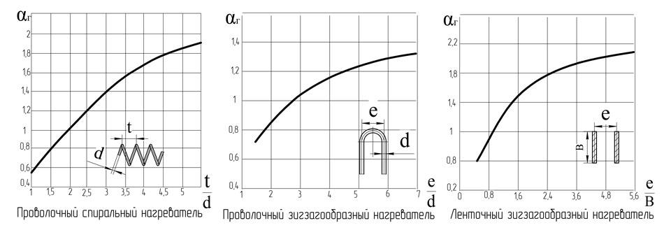 Графики значения коэффициента шага нагревателя αг для различных вариантов нагревателей.