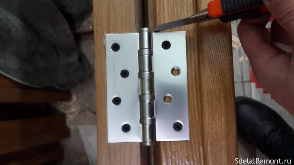 Нужно обратить внимание на петли, какой там продольный зазор. Всё учли, делаем запил ширины