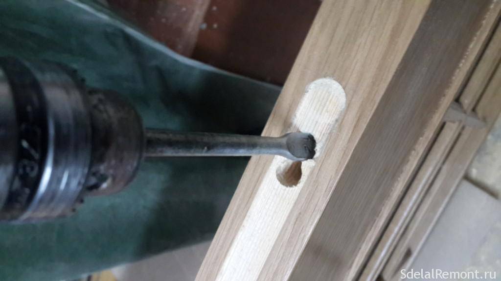 Далее коронка меняется на сверло перьевое, и так же аккуратно высверливается отверстия под защелку.