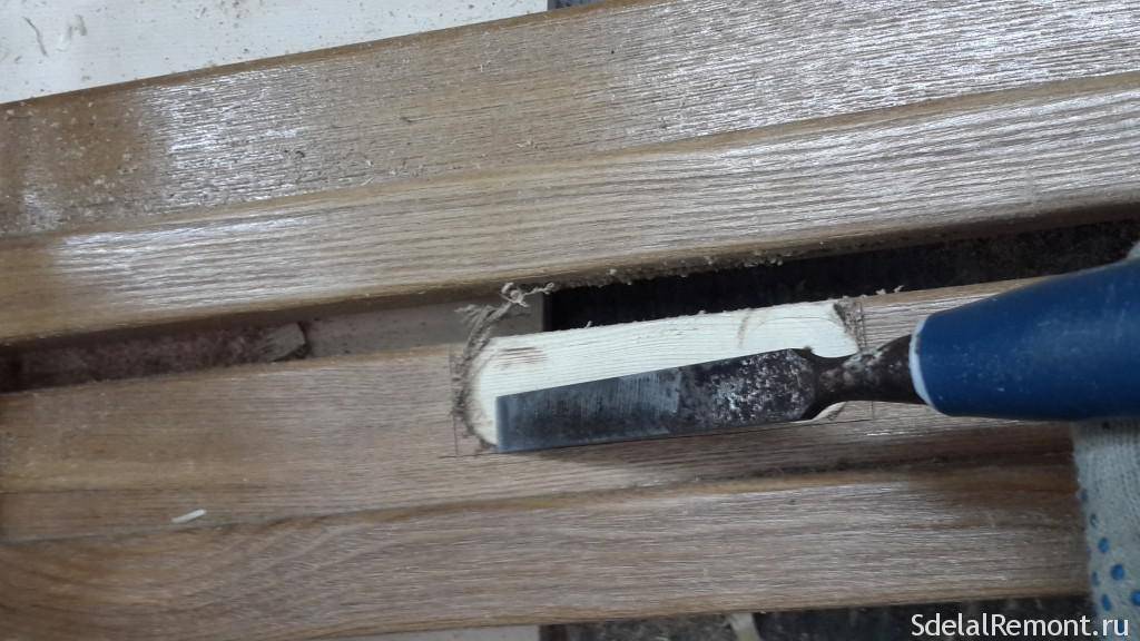 Стамеской подравниваем паз для замка. У меня не оказалось сверла диаметром 13-14 мм, поэтому пришлось в конце подравнять фрезером, чтобы получить достаточную ширину паза для замка. Но если сверло было бы нужного диаметра, то ничего подравнивать не пришлось бы, получился примерно такой паз, только с неровным краем.