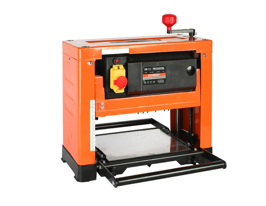 Рейсмусовый станок PATRIOT TP 255 представляет собой мобильное оборудование, которое служит для строгания деревянных заготовок под заданную толщину. Откидное исполнение удлинителей рабочей стола способствует компактности конструкции. В случае чрезвычайной ситуации остановка агрегата осуществляется максимально быстро, достаточно нажать на красную кнопку. Мерная шкала, которая располагается на передней панели, гарантирует точность выполнения операций.