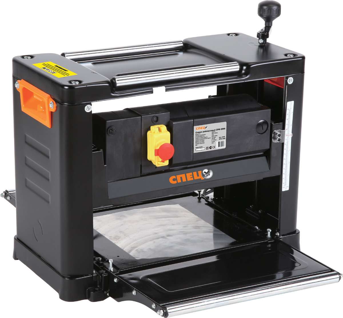 Рейсмусовый станок с механической подачей СПЕЦ СРМ-2000 служит для работы на небольших строительных участках или в мелкосерийном производстве. Два ножа из быстрорежущей стали обеспечивают оптимальный результат обработки. Для точной настройки толщины стружки, а также для быстрого и точного строгания имеется хорошо читаемая шкала. Идеально гладкая поверхность стола облегчает процесс подачи заготовки благодаря хорошему скольжению.