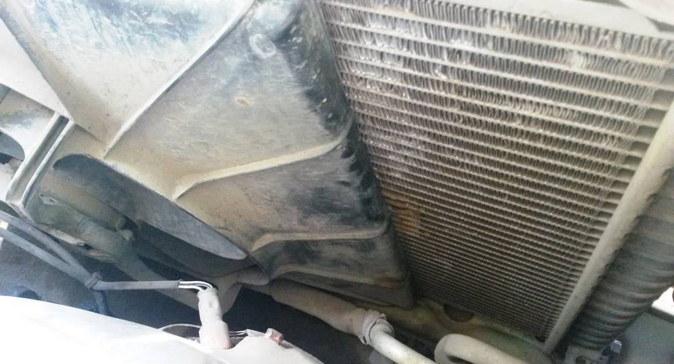В этом месте кожух вентилятора от нагрева выгнулся и начал тереть по радиатору. Образовалось три дырки, через которые попер антифриз. Помню эту ночку. Хорошо, что в пределах города был.