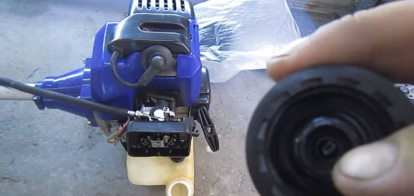 - Второй способ — если бензокоса не заводится или после непродолжительной эксплуатации глохнет двигатель. Это косвенные признаки того, что карбюратор не может закачать топливо в систему за счет создавшегося давления внутри бака.