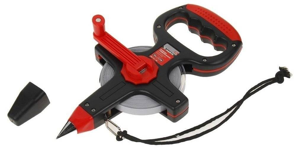 - геодезические. Их еще называют землемерными. Оболочка выполнена из пластика или металла, лента — из стеклопластика. Способ сматывания — ручной, с помощью специальной рукоятки на корпусе. Зацеп кольцевидный. С его помощью можно зацепить измеритель за колышки;