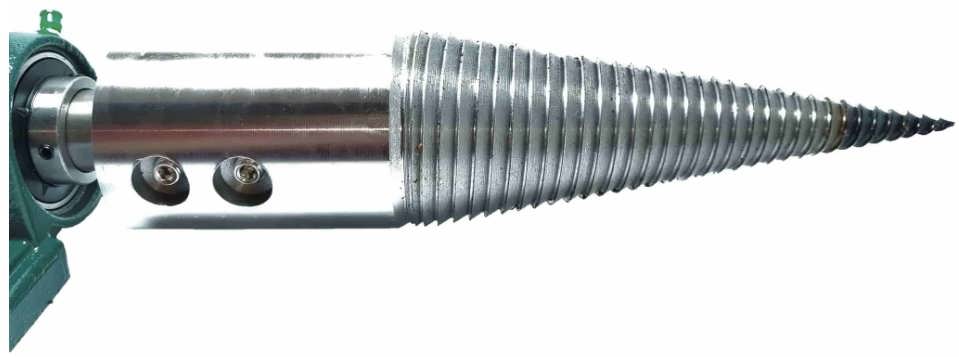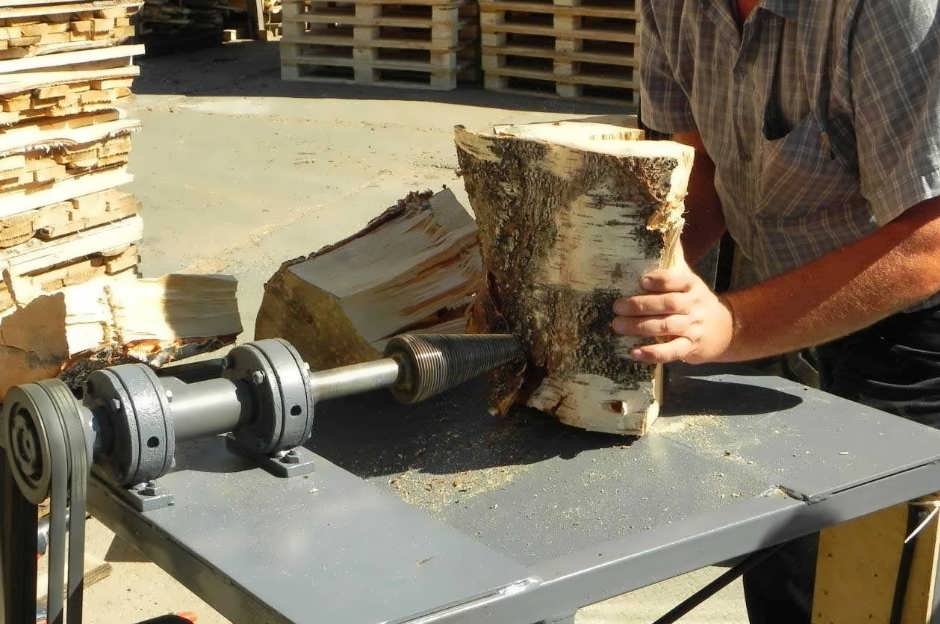 Такой станок раскалывает поленья за счет резьбового клина, ввинчивающегося в древесину. На рабочий винт передается вращательный момент.