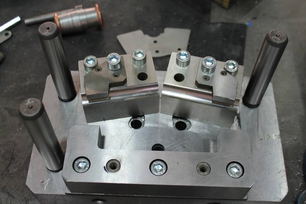 Сначала начинает двигаться внешний ползун, после достижения им самой крайней нижней точки, он замирает и фиксирует край детали на поверхности матрицы.