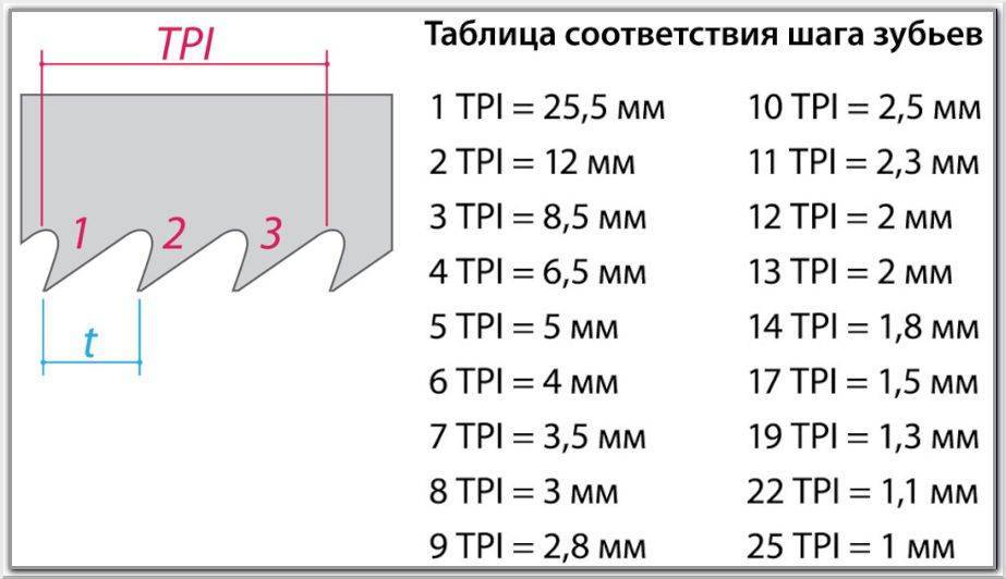 Чем меньше шаг зубьев, тем больше их количество на дюйм и выше показатель TPI (Tooth Per Inch). Полотна с высоким показателем TPI, предназначаются для медленного, но очень аккуратного распила. Чем ниже количество зубьев на дюйм, тем работа быстрее, но края и боковые сечения изделия менее ровные. Для универсальных работ, с оптимальным соотношением скорости и качества, используется полотно со значением TPI 8.