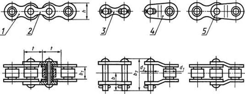 Классификация передач. Приводные роликовые цепи различают (рис. 77): однорядные нормальные (ПР), однорядные длиннозвенные облегченные (ПРД), однорядные усиленные (ПРУ), двух (2ПР)-, трех (ЗПР)-и четырехрядные (4ПР) и с изогнутыми пластинками (ПРИ).
