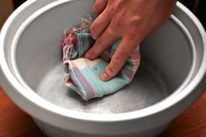Бока кастрюли можно обмотать ветошью, пропитанной соответствующим составом, и несколько раз смачивать им же, не допуская пересыхания. После замачивания утварь промывают под струей прохладной воды и оттирают загрязнения мягкой тряпочкой.