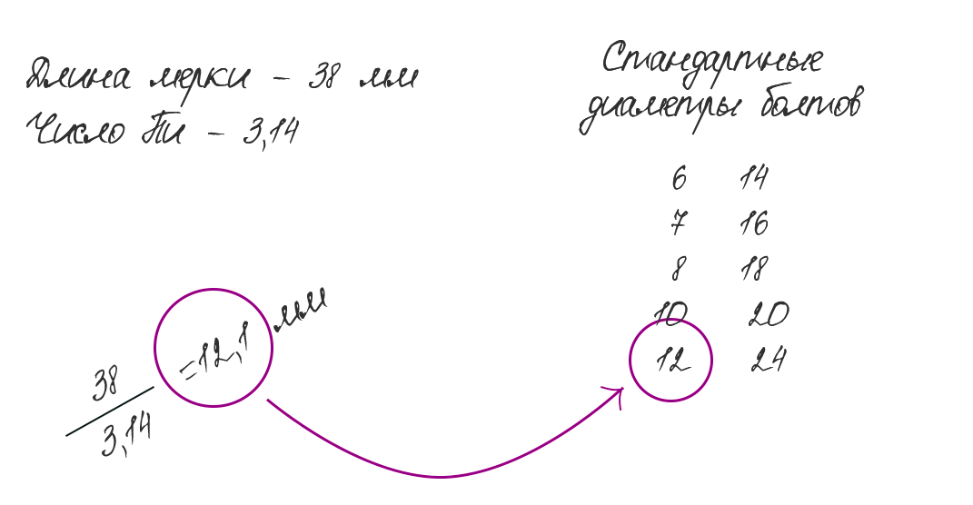 Зная длину окружности, с помощью простой геометрической формулы с легкостью рассчитываем диаметр. Для этого длину окружности делим на число Пи, равное 3.14. Поскольку у большинства автомобильных болтов стандартные диаметры, то, даже с учетом погрешностей в измерениях, результат будет близок к стандартным размерам. Стандартные диаметры болтов применяемых в автомобилях: 5, 6, 7, 8, 10, 12, 14, 16 и т.д.