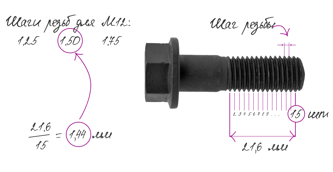 - Чтобы узнать шаг, нужно взять диапазон в миллиметрах и разделить на полученное количество витков, например, на диапазоне 20 мм было насчитано 17 витков. Если разделить 20 мм на 17 витков, то получим значение 1,17, что соответствует ближайшему стандартному шагу в 1,25 мм. Для проведения более точных подсчетов необходимо отнять один виток, так как отчет нужно проводить не с одного, а с нуля, поэтому получим 20/16=1,25 мм