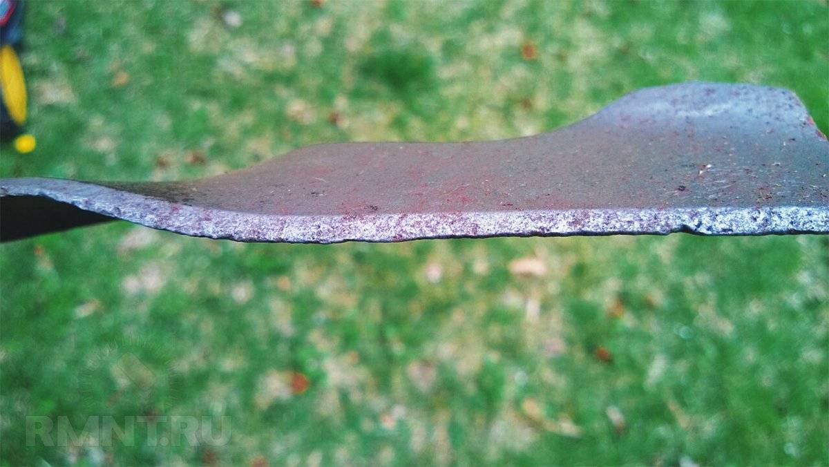 Часто из-за попадания в рабочую зону твёрдых предметов, таких как камни и щепки, лезвие весьма ощутимо деформируется. Большинство лезвий сами по себе не прямые, однако режущую кромку и полосу в 10-15 см от неё нужно обследовать на предмет наличия локальных бугров и искривлений. Делается это с помощью короткой ровной линейки.