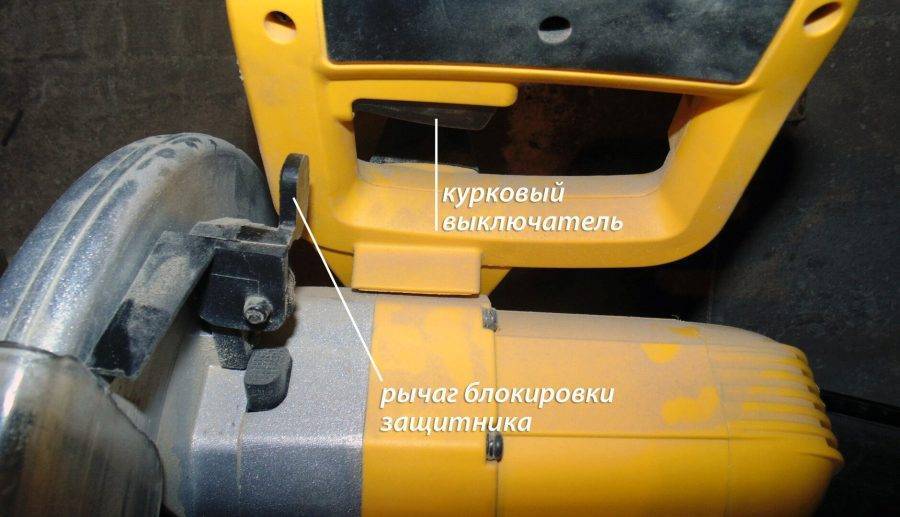 Казалось бы, чего тут сложного? Просто подключаешь агрегат к сети и нажимаешь на «спусковой крючок», чтобы разрезать очередную заготовку. Однако это совсем не так. Производители прекрасно осведомлены о том, что этот мощный электроинструмент способен в одно мгновение нанести рабочему серьезную травму. Поэтому при нажатии на курок торцевая пила запускается в холостом режиме, а резать она начнет после того, как будет снята блокировка в виде специального рычага на корпусе, отрезной диск опустится вниз и коснется обрабатываемой детали.