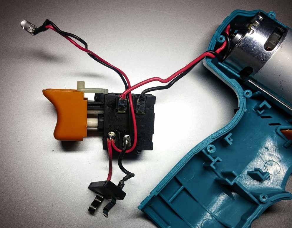 Соблюдая полярности, припаять новую кнопку к контактам электрического мотора. Дабы убедиться в том, что все операции были выполнены правильно, специалисты рекомендуют проверить кнопку на включение и плавность вращения шуруповерта. Только после этого можно приступать к сборке корпуса.
