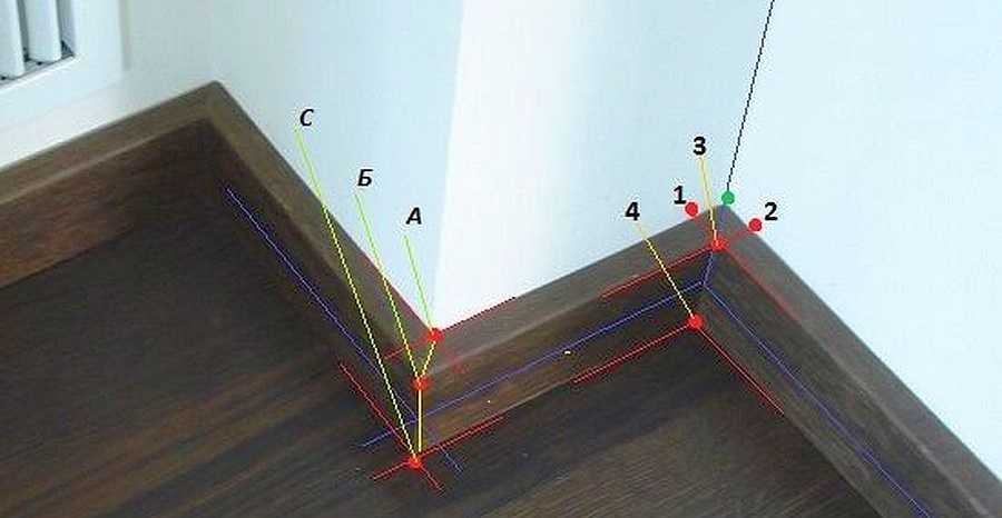 Как резать плинтус: в углах делаются необходимые пометкиВажно: подрезку наружных углов сделать легче чем внутренних. На левом и правом отрезках выставляем точки: А – отметка вершины угла стены; С – точка пересечения линий, которая получается при поочередном отчерчивании левого и правого отрезков плинтуса по полу; Б – от точки С поперек молдинга проводится линия к противоположному его краю. . Соединив эти точки между собой одной линией, мы получаем линию, по которой будет делаться срез