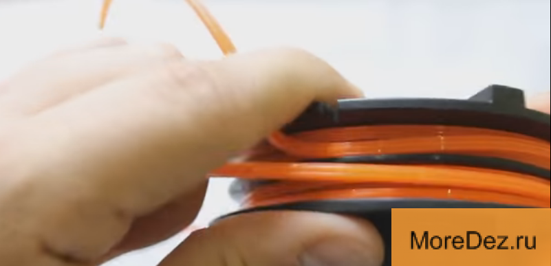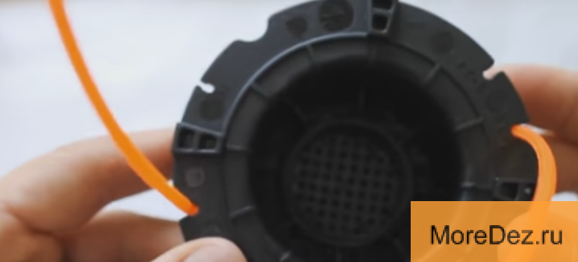 Кончики проделываются в отверстия корпуса шпули триммера. Их подтягивают до щелчка, который обозначает, что леска вышла из фиксаторов.