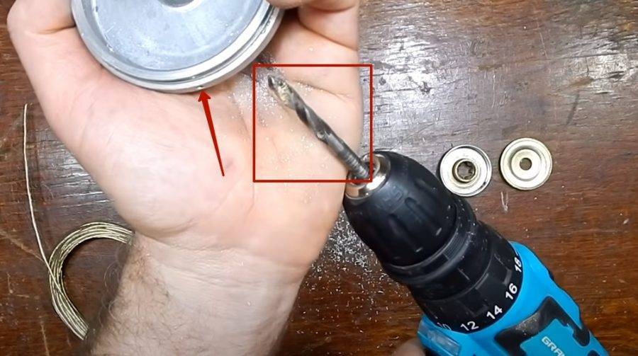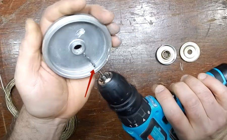 - На противоположных сторонах диска крепят небольшие проушины, которые будут служить для заправки лески.