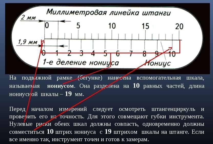 Обратите внимание на то, что первый штрих нониуса не доходит до второго штриха шкалы штанги ровно на 0,1 мм (2 — 1,9 = 0,1). Это и позволяет производить замеры с точностью до 0,1 мм