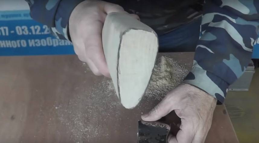 Размер рукояти изготавливается согласно общепринятым критериям, но лучше изготавливать индивидуально под размер своей руки. После проверки на соответствие всех размеров, проводится доводка при помощи напильника с крупной насечкой. Удалять излишки вокруг контура проушины стоит отступив от разметки 2-3 мм. Завершается этап обработкой деревянной части наждачной бумагой.