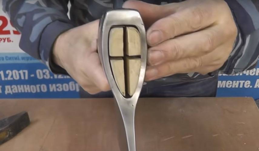 При изготовлении клиньев важно, чтобы размеры поперечных изделий соответствовали величине проушины. В некоторых случаях проушина может иметь зазоры. Исправить их можно при помощи марли или бинта, пропитанных в эпоксидной смоле