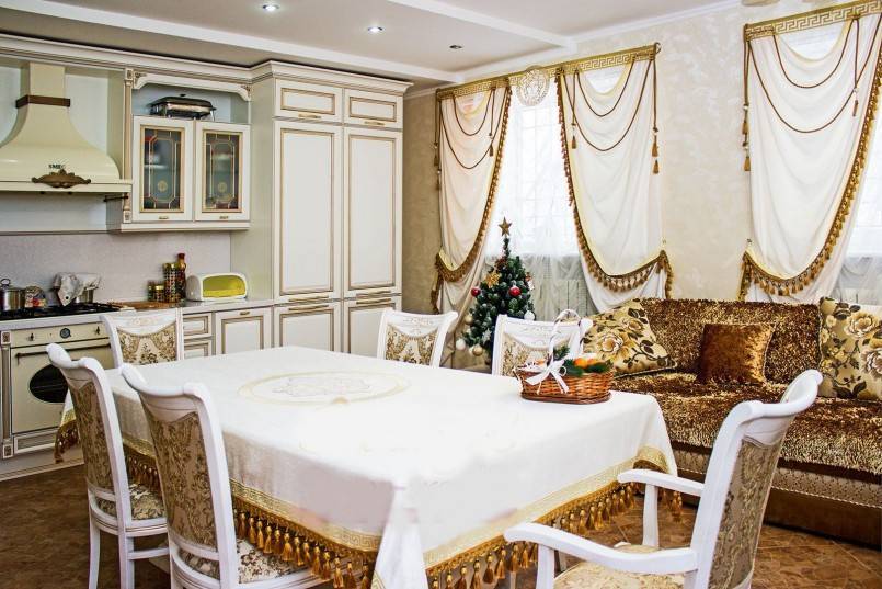 Если ваша кухня убрана в классическом стиле, обратите внимание на занавески с матовыми прямыми ниточками, вертикальные полоски визуально делают потолок выше