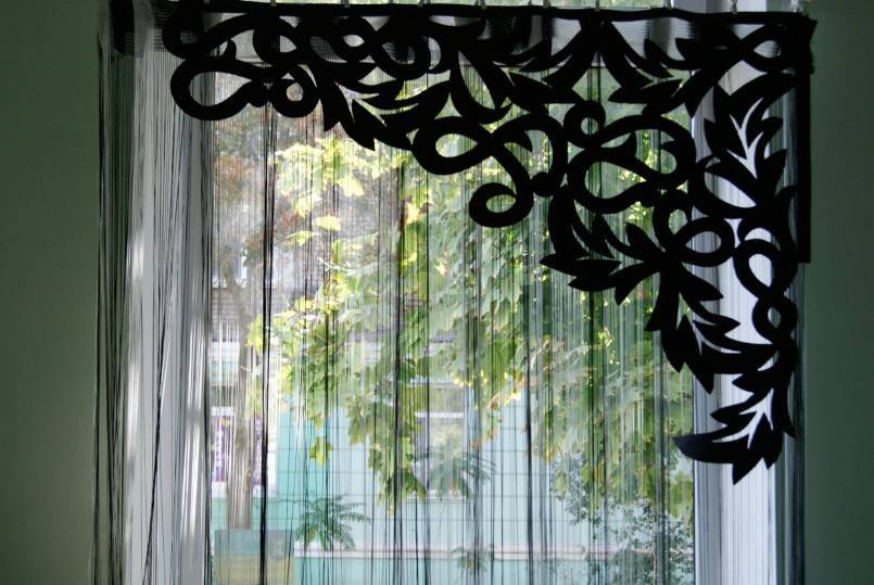 - Шторы следует обрезать ножницами аккуратно на весу, при этом не нужно нити натягивать. Обрезать можно как ровно, так и создавая фигурный низ. Чтобы удалось ровно обрезать шторы, рекомендуется воспользоваться книгой или картонкой, которая будет придерживать нити для обрезания.