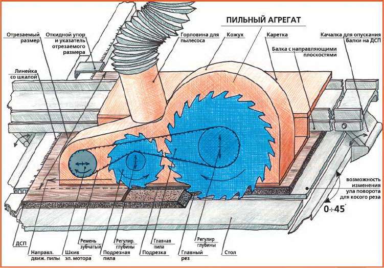 - горизонтальные, состоящие из стола для плиты, каретки для перемещения пилы вдоль пильного механизма и собственно пильного механизма, состоящего из одного или двух режущих узлов. Сами режущие узлы оснащены основной и подрезной пилами. Принцип действия прост: основная пила глубоко прорезает плиту ДСП, а подрезная точно и чётко дорезает нижний край (шпон или ламинированную поверхность). Пильный узел можно ещё и наклонить до 45°.