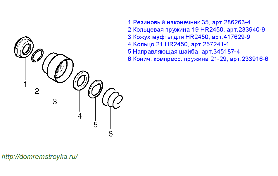 При помощи плоской отвертки разбирается патрон. Ремонт перфоратора «Макита 2450» своими руками начинают с этого элемента. Отжав крышку патрона, снимают резиновый пыльник. Демонтируется стопорное кольцо. Затем снимается крышка патрона и металлическое кольцо. Оно запирает в стволе шарик фиксации бура. Он вынимается, и металлическая шайба, коническая пружина достаются без усилий.