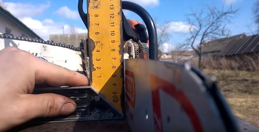 - Режущий элемент необходимо проверить на слабость затяжки, для чего взяться за звено и попытаться оттянуть его вверх. Нормальное значение натяжения должно соответствовать выходу хвостовиков из шины(в ее середине) не более 2/3.