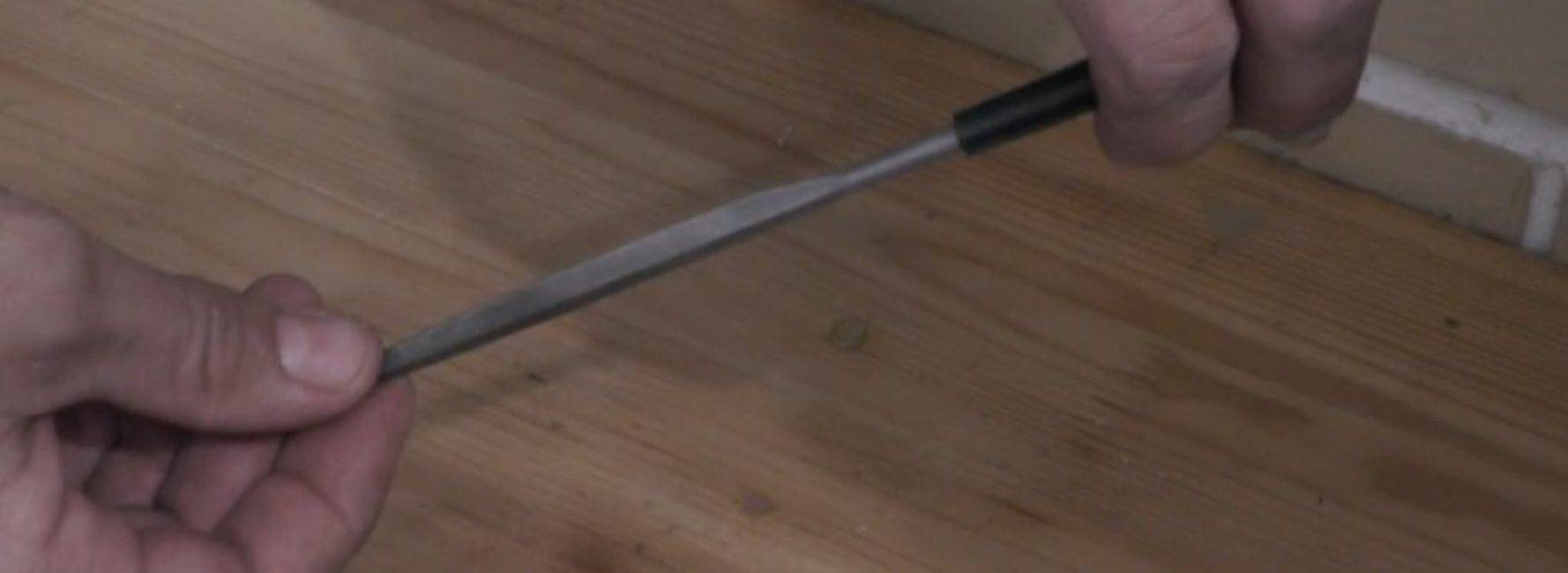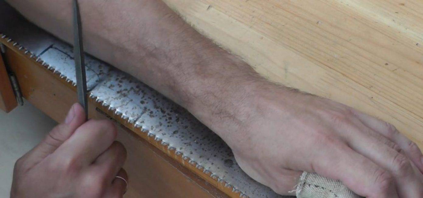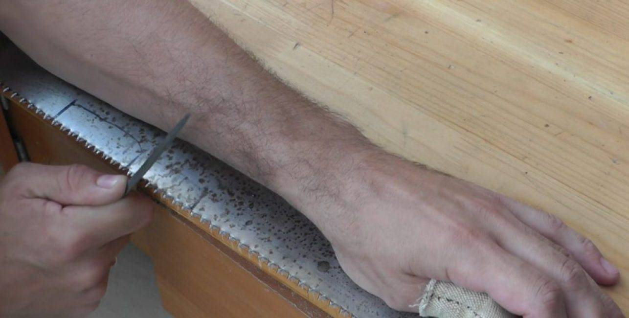 В правую руку берётся напильник или надфиль, и, прижимая левой рукой полотно ножовки, приступают к заточке.