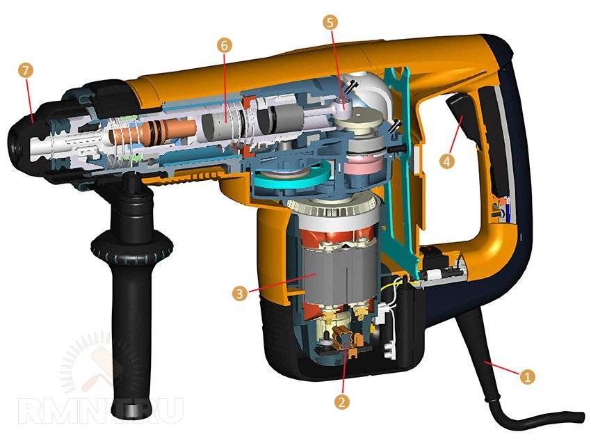 Устройство бочкового перфоратора: 1 — сетевой шнур; 2 — угольные щётки; 3 — электродвигатель; 4 — выключатель; 5 — эксцентриковый механизм; 6 — ударный механизм; 7 — быстросменный патрон