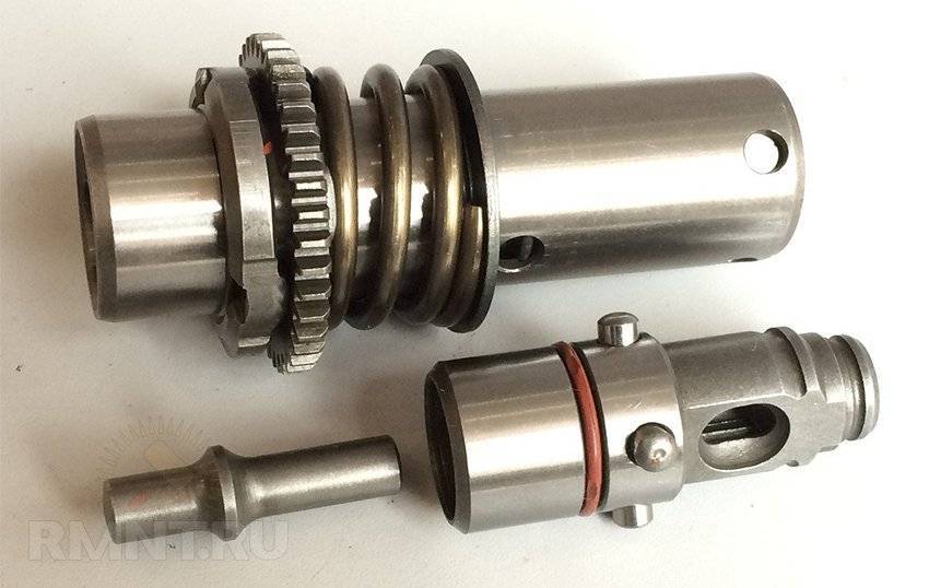 Чтобы разобрать растровую втулку, нужно сжать пружину, снять стопорное кольцо и шестерню.