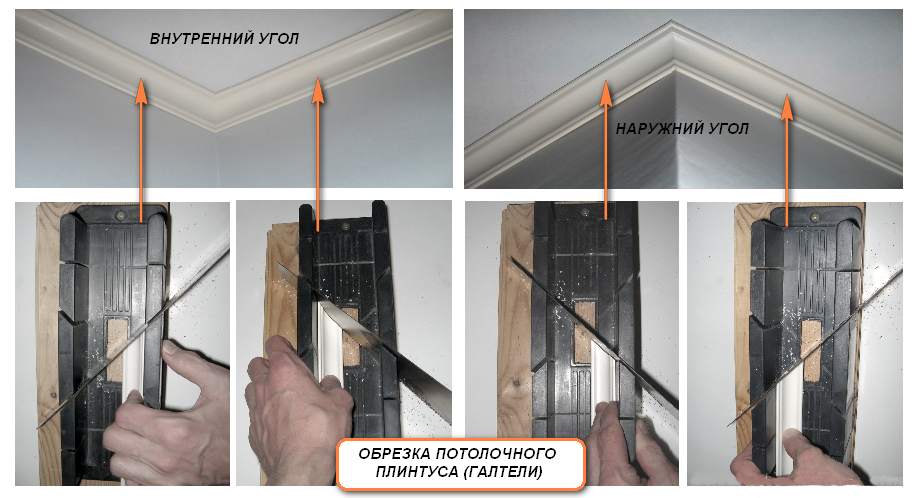 При зарезки потолочного плинтуса направление лезвия остается прежним. Однако сам элемент надо прикладывать к внутренней стороне, а нижнюю располагают сверху.