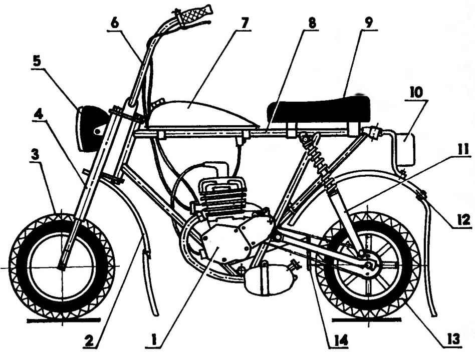 1, 2 — переднее колесо и крыло; 3 — система подвески переднего колеса; 4, 5 — фара и кронштейн фары; 6 — спидометр; 7 — бензобак; 8, 9 — рычаг и коробка переключения передач; 10 — аккумулятор; 11 — спинка сидения; 12 — задние фонари; 13 — воздушный фильтр; 14 — двигатель; 15 — охладитель; 16 — масляно-воздушный радиатор; 17 — глушители; 18 — заднее колесо; 19 — эластичная муфта; 20 — тормозная тяга; 21 — педаль тормоза; 22 — гудок; 23 — подкосы заднего крыла; 24 — амортизаторы; 25 — каркас для крепления радиатора и глушителя; 26, 27 — заднее крыло и его консоль крепления; 28 — передняя консоль; 29 — кронштейн крыла; 30 — рычаги подвески заднего колеса; 31, 32 — рукоятки газа и тормоза соответственно; 33 — замок зажигания; 34, 35 — педаль сцепления и тяга сцепления; 36 — переключатель скоростей; 37 — руль.