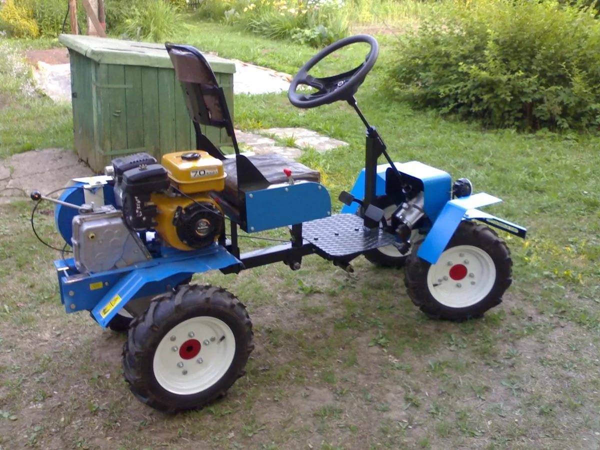 Так же для того, чтобы сделать собственноручно трактор, потребуются два подходящих колеса, навеска, водительское кресло, рулевой механизм, педали и, конечно же, мотоблок, обладающий достаточным весом и мощностью. Лучше остановить свой выбор на агрегате тяжёлого класса с дизельным двигателем (хорошо подходят модели Зубр, Нева, Агро, Скаут). Это даст возможность получить в результате переделки хоть и самодельный, но производительный минитрактор, способный эффективно выполнять различные агротехнические операции. Наверняка захочется, чтобы он осуществлял не только сельскохозяйственные функции, но и мог тянуть прицеп.