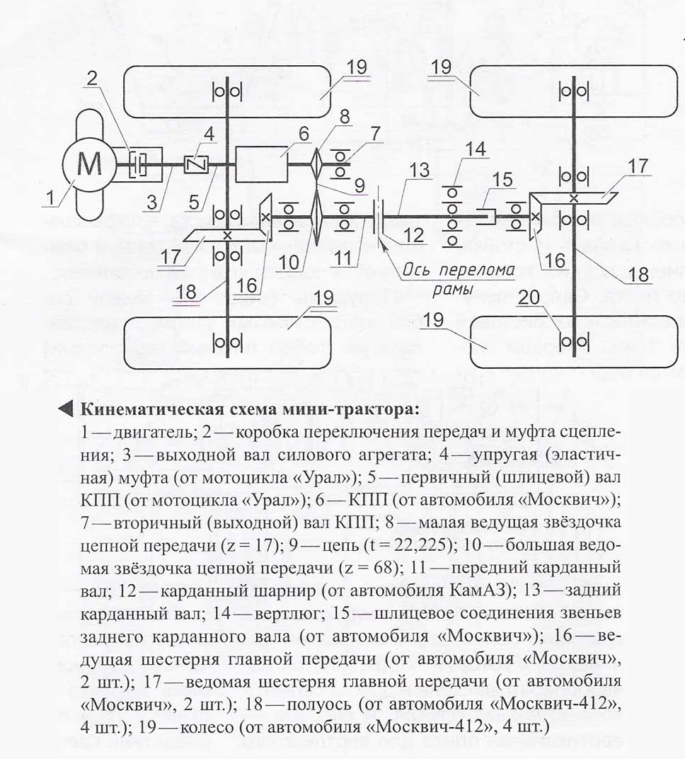 Процесс создания самодельного минитрактора начинается с составления чертежа, кинематической схемы будущего «пахаря» и подготовки необходимых материалов, инструментов, оборудования. Если есть навыки, можно самому разработать схему демонстрации механизмов и узлов трактора, если нет – найти подходящий вариант в Интернете или же воспользоваться представленным здесь примером.
