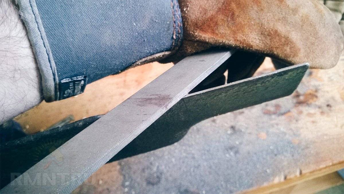 Небольшие отклонения угла заточки не критичны, однако чем ровнее будут выведены спуски, тем больше будет ресурс ножа. При выведении формы лезвия оно всегда двигается на зерно во избежание образования крупных заусенцев и облоев. Использовать болгарку для предварительной заточки не следует — перегрев может ухудшить качества металла. Однако можно установить на УШМ лепестковый или тарельчатый диск под наждачную бумагу.